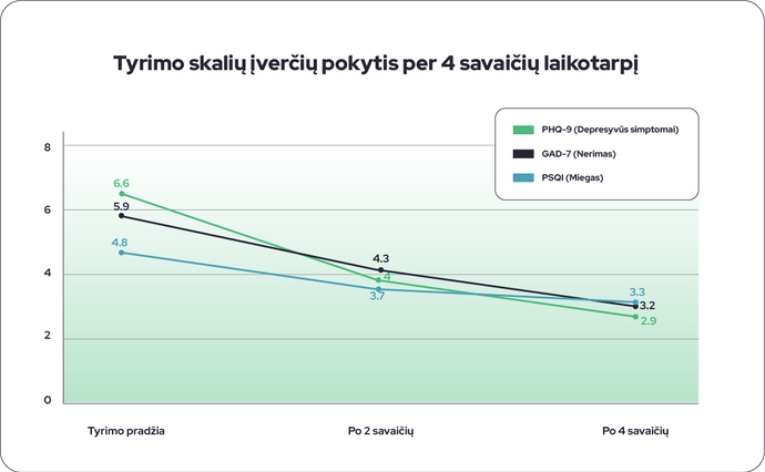 - Ryškų nerimo ir depresijos simptomų sumažėjimą;